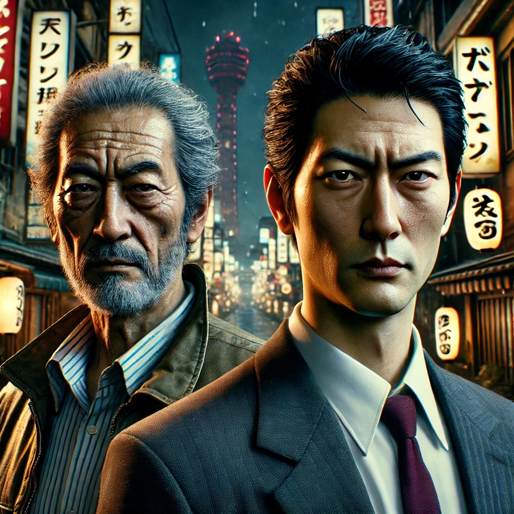 DALL·E 2025-08-08 17.37.08 – A cinematic scene inspired by Japanese V-cinema. Two Japanese men, both with distinctly aged and mature faces, deep lines and some gray hair. One is i