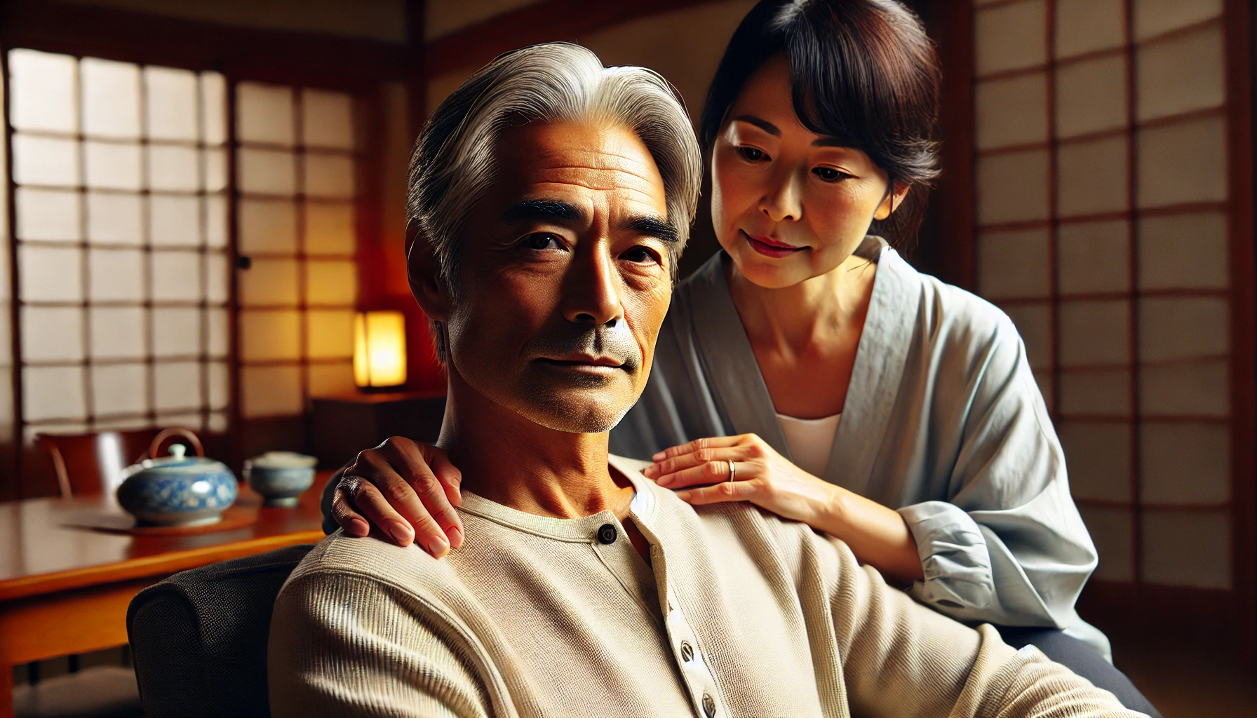 DALL·E 2025-07-31 09.13.40 – A close-up, intimate portrait of a Japanese retired professional athlete and his wife in a cozy home setting. The man, a former athlete, appears relax 2025/7/31 ※本サイトのコンテンツには、商品プロモーションが含まれています。 スポンサードリンク